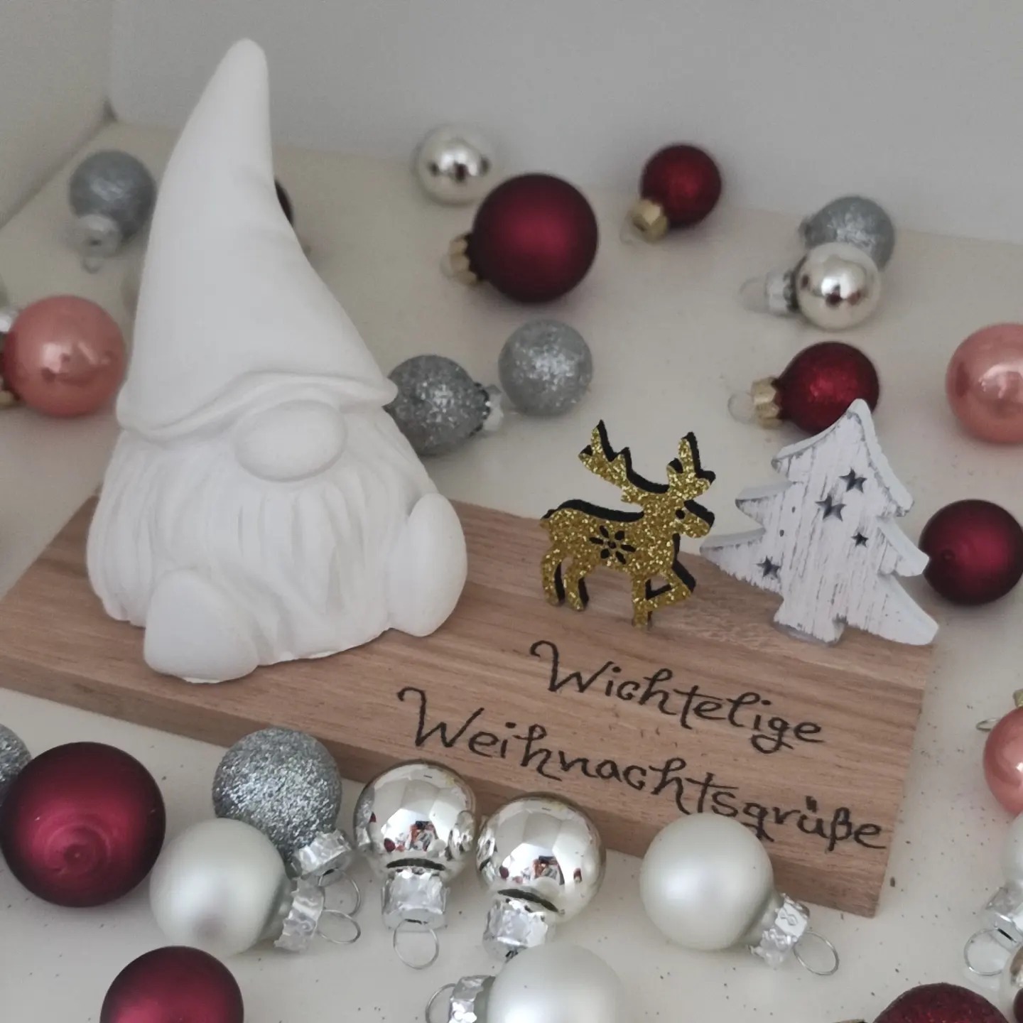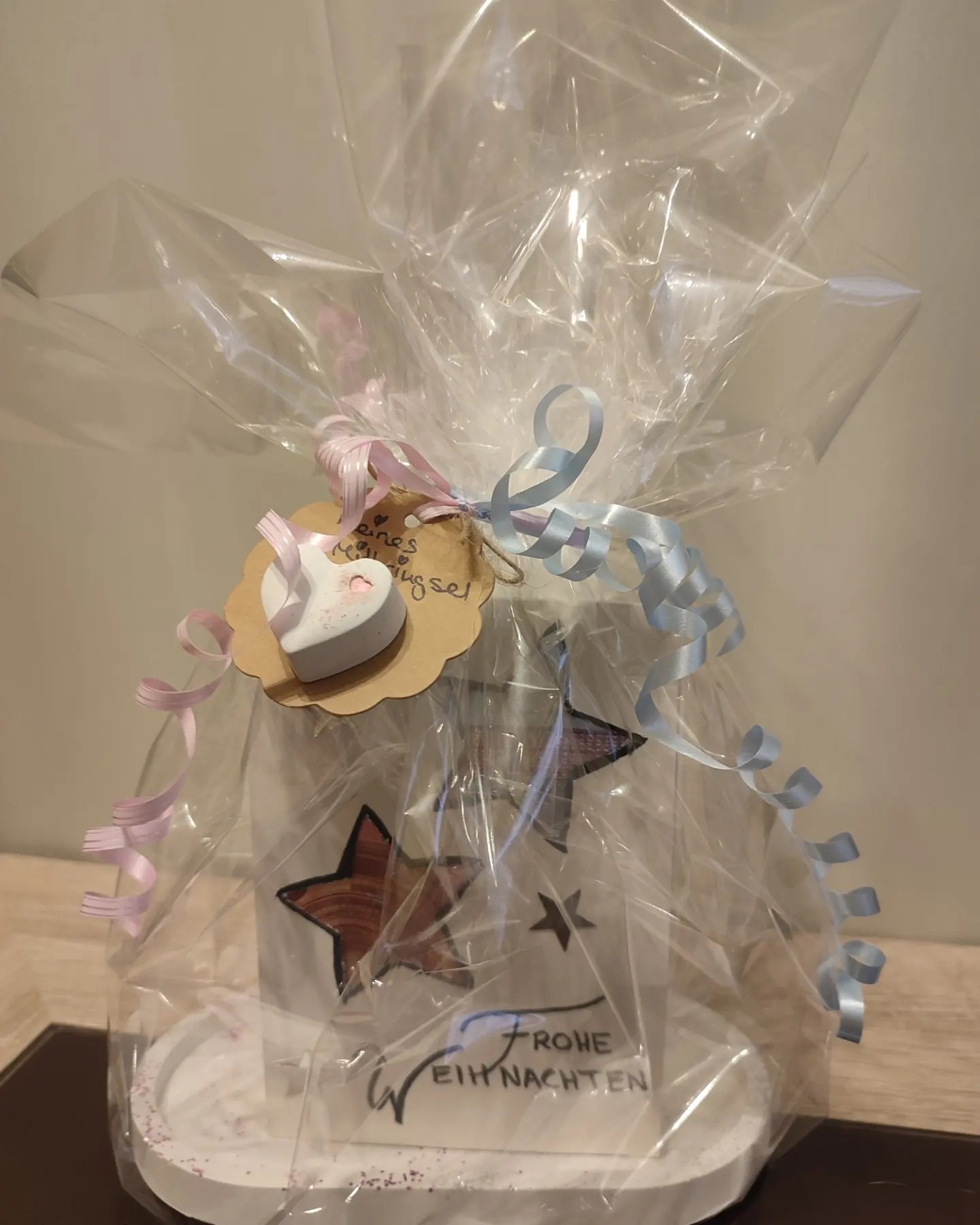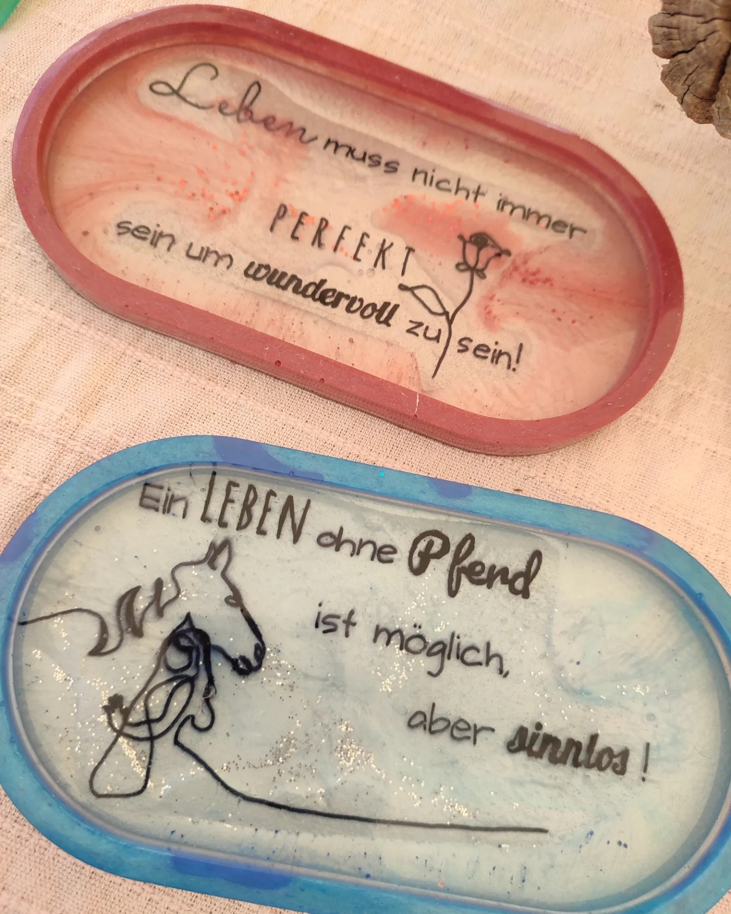- auf Holzbrettchen / Schale mit passender Deko, Spruch, Name, Daten… Preis je nach Aufwand