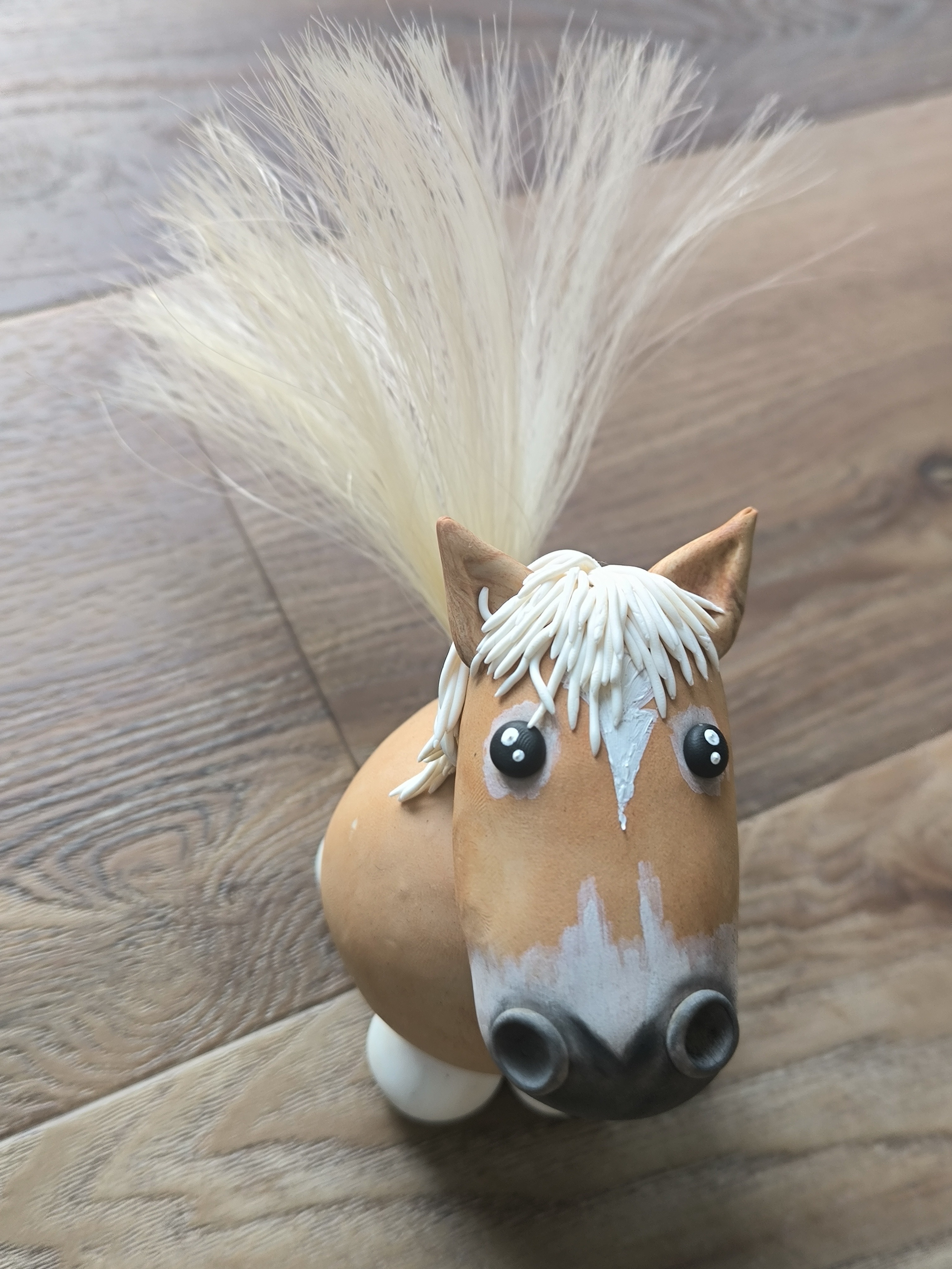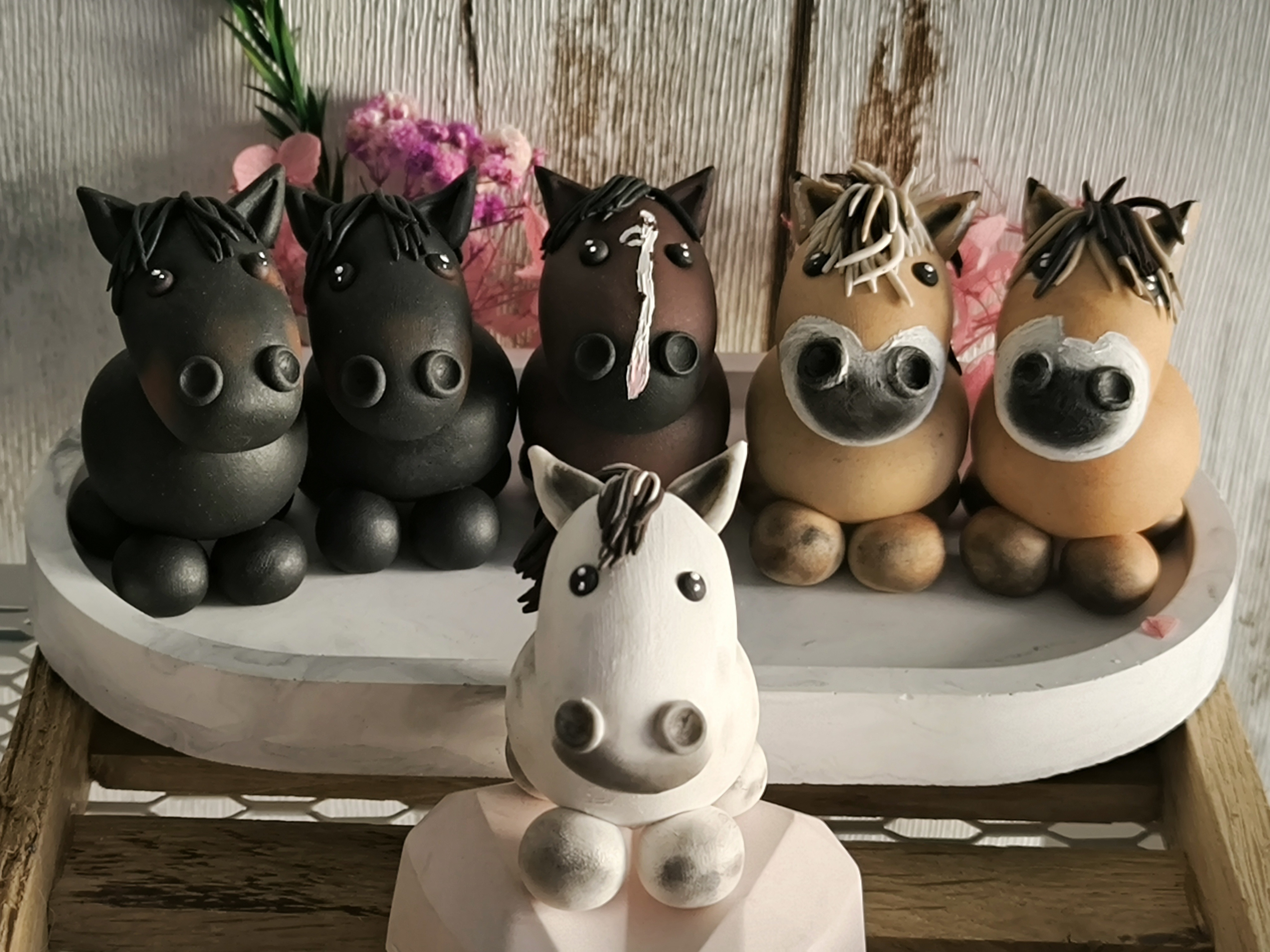 Kleine, comicähnliche Pummelponys mit modellierten und nicht mehr nur aufgemalten Augen und auch die Nüstern sind modelliert und keine einfachen Löcher mehr. Der Ansatz der Mähne authentischer, der Schweif wäre aus Fimo oder aus dem echten Haar deines Pferdes möglich. Details wie Brandzeichen werden aufgemalt.