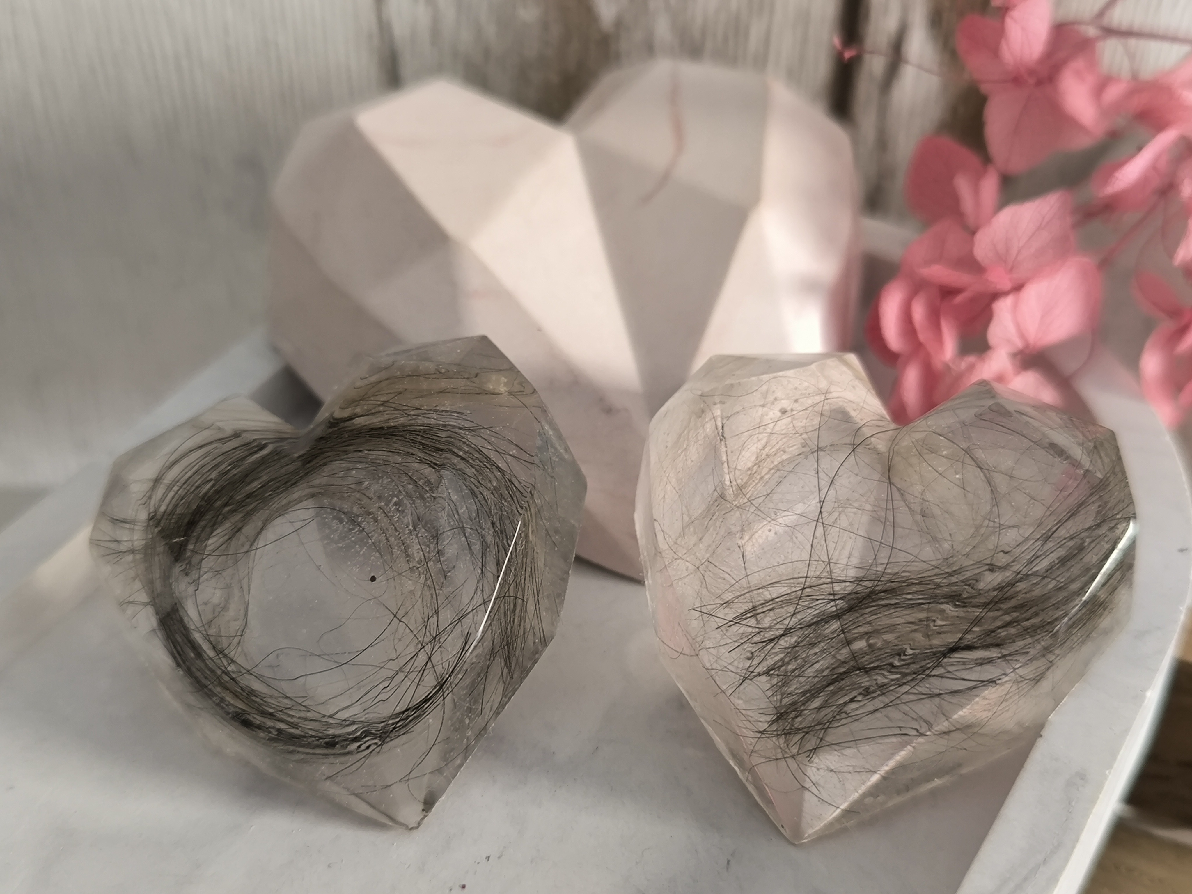Hier findest Du eine Auswahl an Möglichkeiten das Haar oder andere Erinnerungen wie Zähne, Federn oder Asche in Harz einzugießen.
